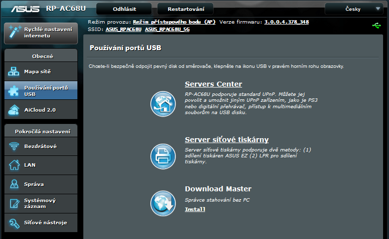 - Tiskový server - pokud k USB portu připojíte tiskárnu, pak se z obyčejné tiskárny stane síťová
