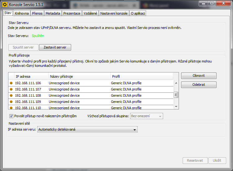 DLNA - serviio - server aktivní, zařízení neaktivní