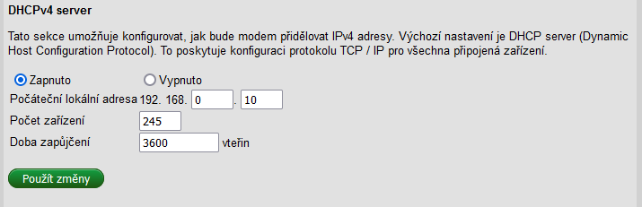 připojených zařízení max. 245 => 192.168.0.10 - 254.