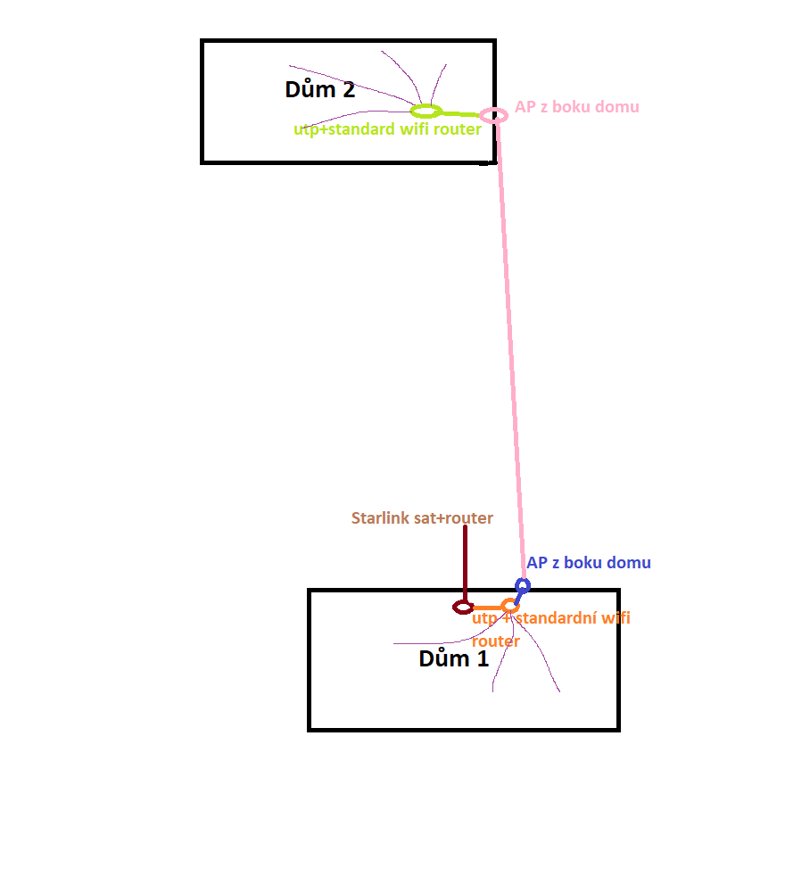 Spíš mě zajímá, jak natáhnout ten kabel do druhého domu tak, aby to dávalo smysl. Protože ze satelitu jede jejich ethernet s proprietárními koncovkami do jejich routeru. Takže z jejich routeru UTP do běžného a z běžného pak do AP. Já jsem chtěl koupit Cat5e 75m a propojit dvě AP. Přikládám náčrt jak si to představuju.