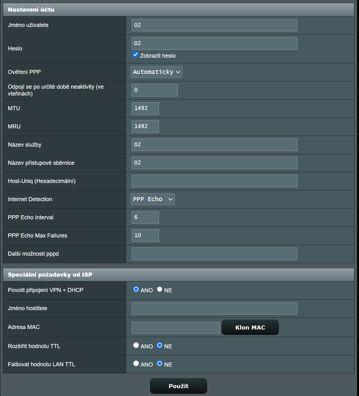 Různě tady na foru, stránkách O2 a Asusu jsem našel co je potřeba nastavit aby Asus fungoval v rezimu PPPoE. Když ale nastavím tak nefunguje připojení k internetu.