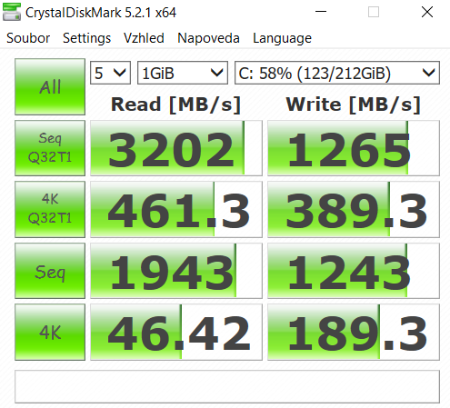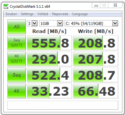 Je fakt, že ve srovnání s http://www.pc-help.cz/viewtopic.php?p=1353313#p1331639 nic moc... Rychlosti se lišit mohou, protože CDM ukazuje max dosaženou, a ta se může lišit dle toho, jak zrovna OS šahá na disk...