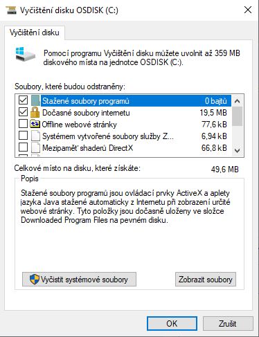 A nyní mě zajímá, co tím myslí tvůrci. Mimo jiné jsou tam možnosti jako: Stažené soubory programů, Dočasné soubory internetu, Dočasné soubory, Miniatury a pod. Tyto odstraňuji. Ještě v tomto okně vlevo dole je možnost ,,Vyčistit systémové soubory". Zde jsem zjisti, že pokud toto udělám, tak se smaže Bod obnovy-(to jen pro informaci).