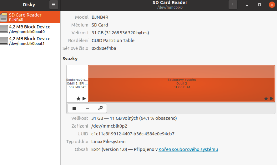 Zbývá ti tak jenom disk mmcblk0, který má dva oddíly: mmcblk0p1 a mmcblk0p2. Ten druhý je /, tedy kořen adresářového stromu, ten první je do něj připojený v adresáři boot jako podadresář efi. Kam je co připojené vidíš vpravo ve sloupci MOUNTPOINT. Pokud tam nic nevidíš, není to připojené nikam.