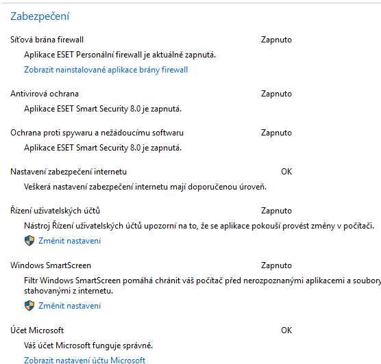 Nefunguje. ESET smart security výchozí FW a defender ivládá, nicméně windows ukazuje, že je vypnutý. A to je špatně. Zkontroluj si ESET, zda všchny štíty běží jak mají.