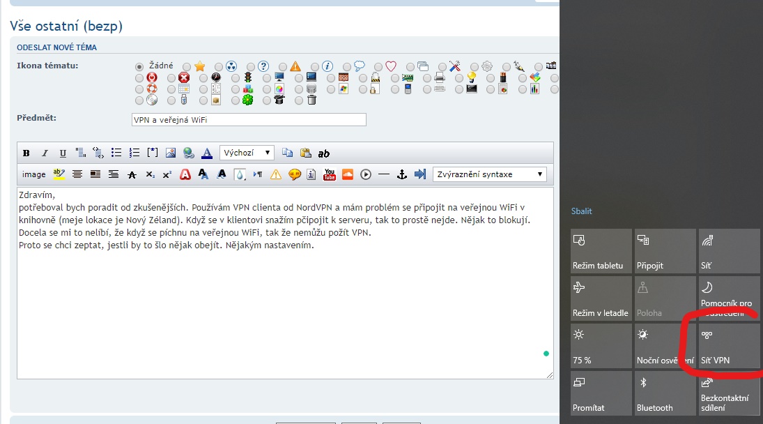 potřeboval bych poradit od zkušenějších. Používám VPN clienta od NordVPN a mám problém se připojit na veřejnou WiFi v knihovně (meje lokace je Nový Zéland). Když se v klientovi snažím pčipojit k serveru, tak to prostě nejde. Mám přidaný doplněk do Chromu a dokud jsem ho nevypnul (přes hotspot k mobilu) tak jsem se nemohl přihlásit do sítě přes login, kterej mě směřoval na webové strínky. Nějak to blokují. Docela se mi to nelíbí, že když se píchnu na veřejnou WiFi, tak že nemůžu požít VPN. A problém nastává když se chci jen podívat na stránky NordVPN.. nepustí mě to tam.. (vše v příloze)