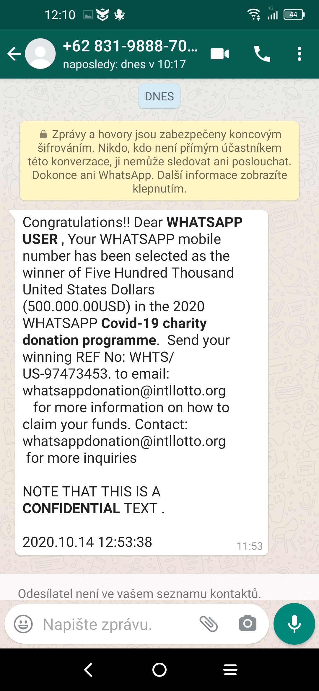 na whatsapp dorazila mí zpráva o výhře v loterii