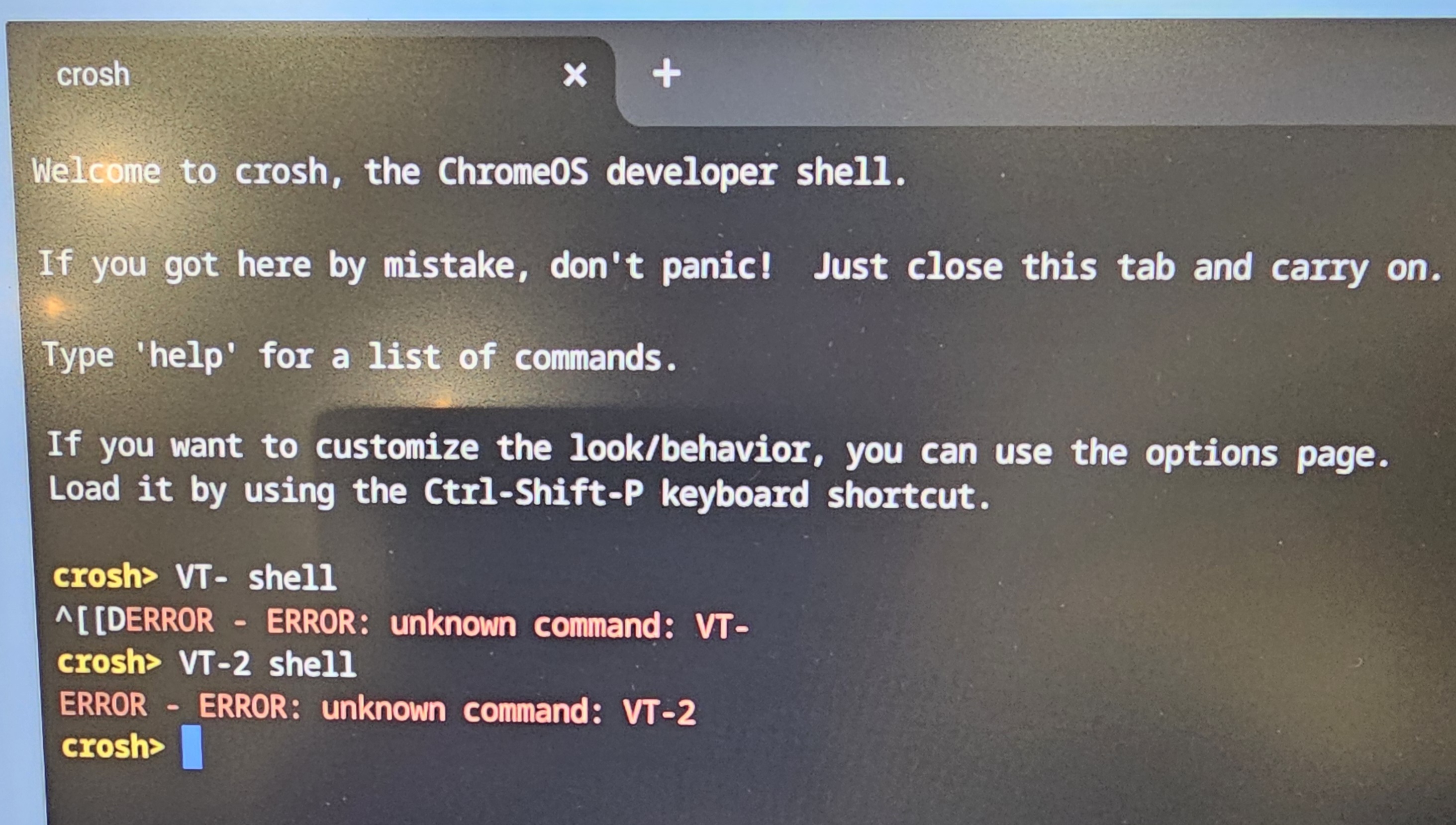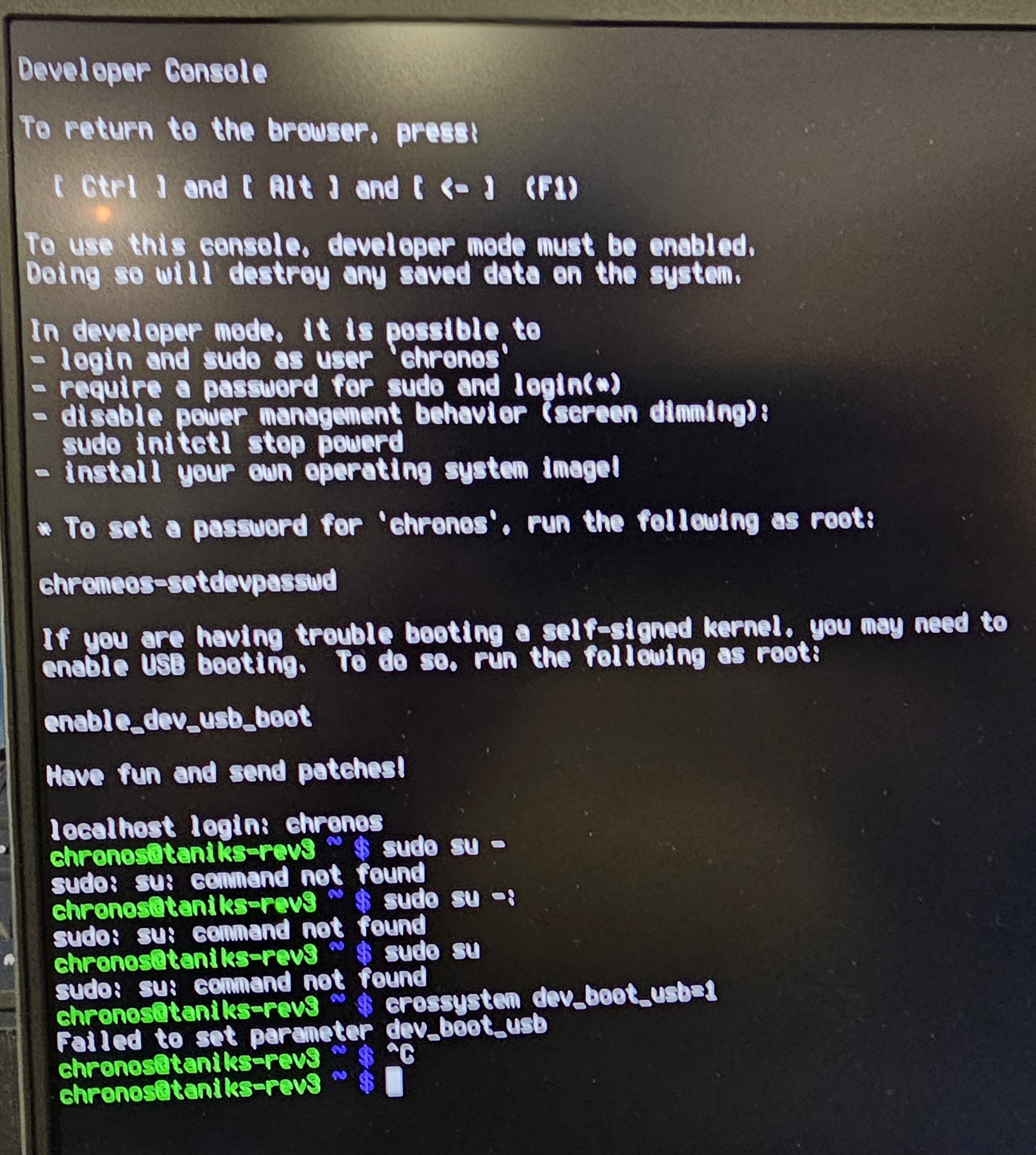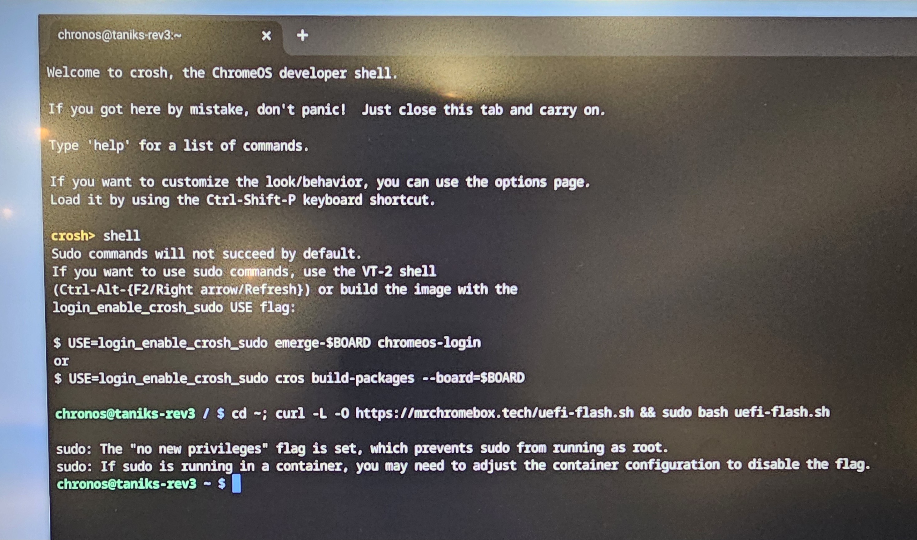 Ok, přepnul jsem to do režimu vývojářů, pak se to spustilo jakoby po továrním nastavení, přihlásím jsem se je Google, ale nefungují mi ty příkazy, v Linuxu jsem ztracenej, viz foto. Už ten příkaz shell nefunguje a to druhý nevyvolává vůbec dotaz na full coreboot firmware